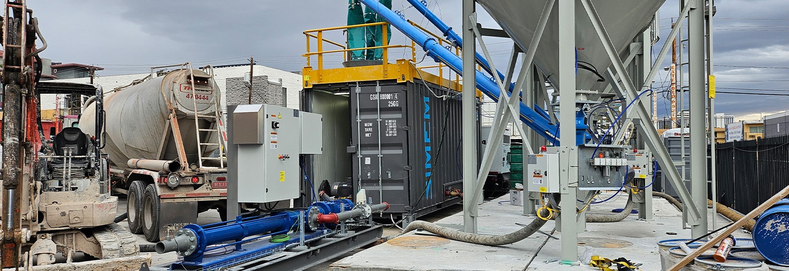 Pumping system design must consider many factors prior to operation. Matching a pumping solution for a specific project application requires extensive knowledge to ensure a pumping system performs as intended. Simem Underground Solutions, and its decades of experience with long-distance pumping of bi-component grouts, cellular concrete, and hydrated bentonite, designs and assembles complete systems guaranteed to perform. System types incorporate piston, peristaltic, progressive cavity, centrifugal, and air-diaphragm pumps. System come complete with associated power control units, instrumentation, and pipe cleaning assemblies. Systems are prepared for field connection as independent components, skid-mounted, or fully containerized.
